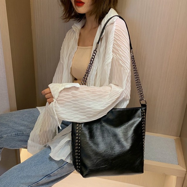 Túi 1 ngăn rộng, dây đeo chéo bằng da nối xích