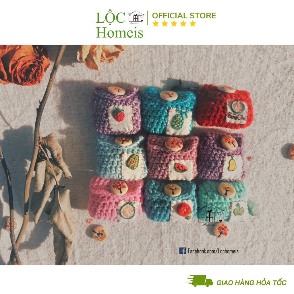 Túi này Lộc kết hợp giữa len cúc tần và thêu tay trên vải bố, Lộc dùng cái cua nhí để treo chứ ko sử dụng móc khóa vì móc khóa nhìn hông có đẹp :)))