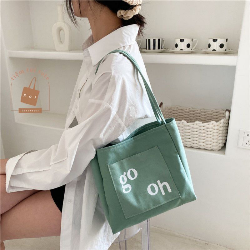 Giới thiệu Túi tote đeo vai in chữ go oh có nút bấm và túi ngoài vừa A4 TP25 | tiemtuitotebypat