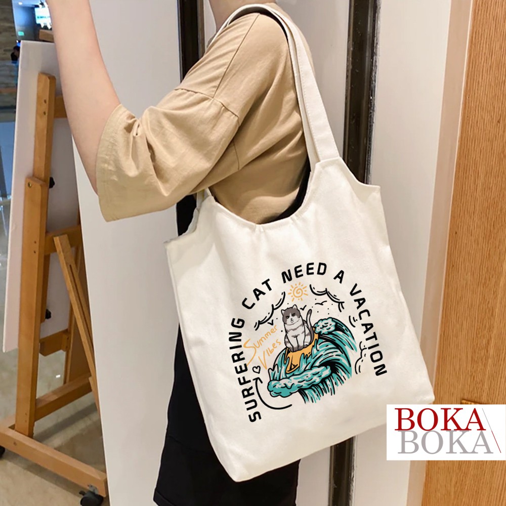 Túi Ví Nữ > Túi tote || Túi Tote Vải Canvas In Hình Summer Cat Phong Cách Ulzzang (Có Khóa Kéo)