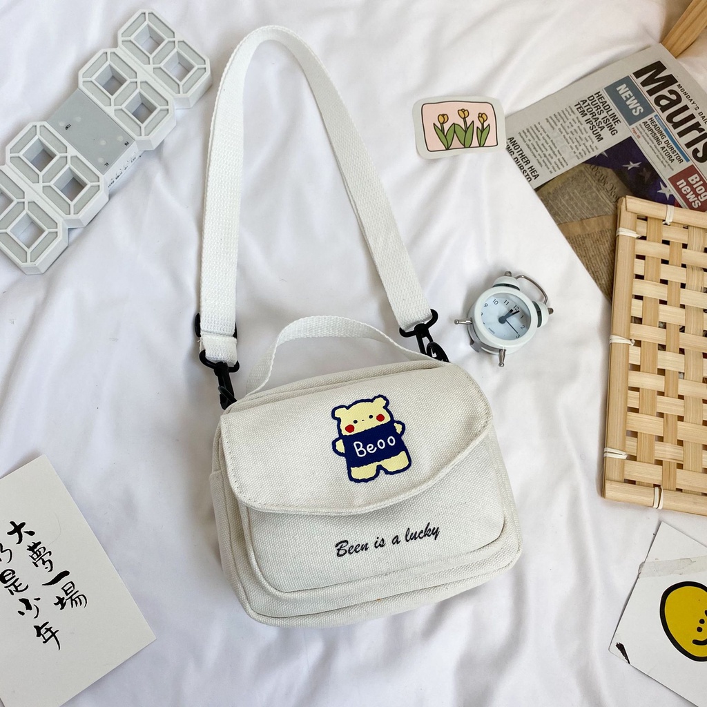 Giới thiệu Túi vải canvas đeo chéo màu hoạ tiết gấu màu Trắng/ Đen/ Vàng