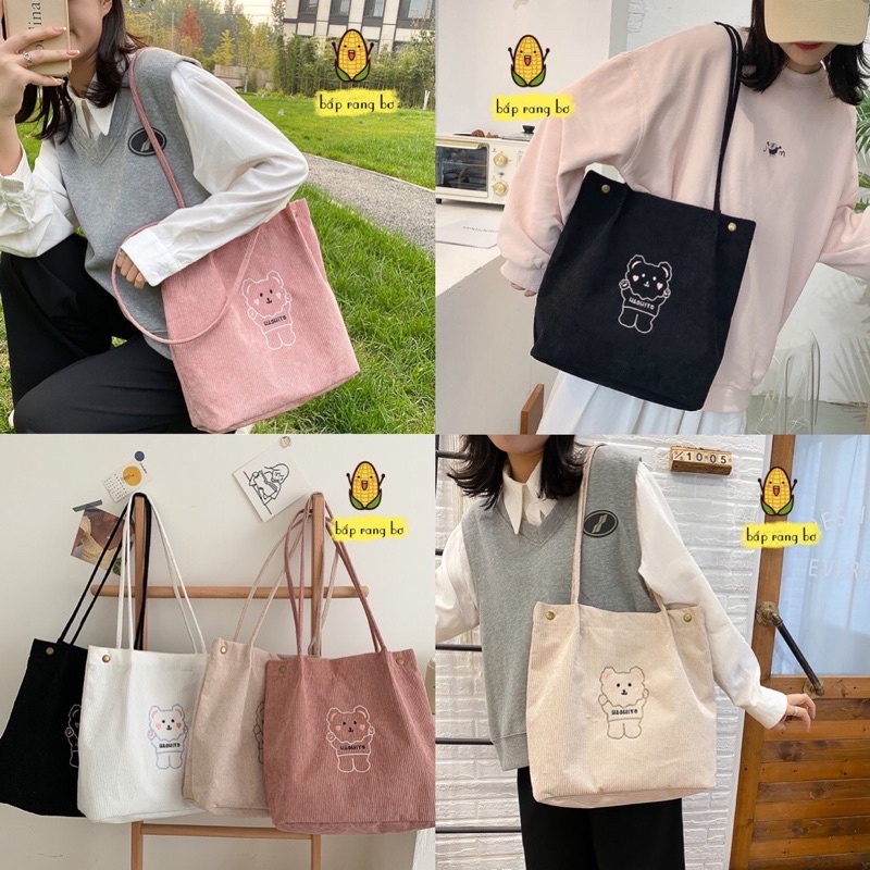 Túi Ví Nữ > Túi tote || Túi Vải Nhung Đeo Vai Hình Gấu Ba Màu So Cutie🦋 Túi Tote Họa Tiết Gấu Đáng Yêu