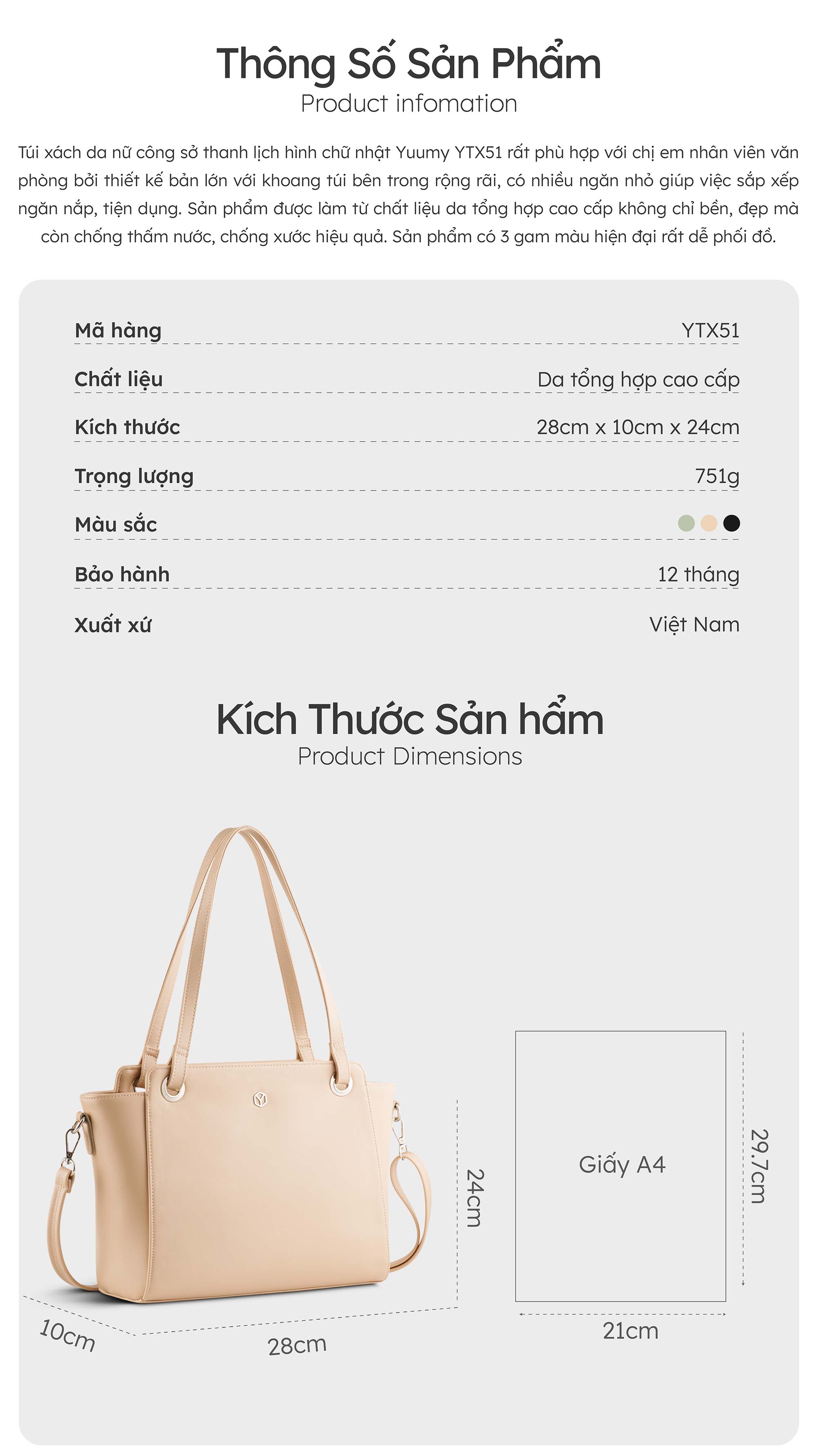 Túi xách da nữ công sở thanh lịch hình chữ nhật Yuumy YTX51 rất phù hợp với chị em nhân viên văn phòng bởi thiết kế bản lớn với khoang túi bên trong rộng rãi, có nhiều ngăn nhỏ giúp việc sắp xếp ngăn nắp, tiện dụng. Sản phẩm được làm từ chất liệu da tổng hợp cao cấp không chỉ bền, đẹp mà còn chống thấm nước, chống xước hiệu quả. Sản phẩm có 3 gam màu hiện đại rất dễ phối đồ, phù hợp mang theo không chỉ lúc đi làm mà những lúc đi chơi, đi du lịch, đi mua sắm, đi cà phê cũng rất đẹp, vừa tôn lên phong cách chỉnh chu, vừa tỏa ra khí chất phóng khoáng của người dùng.