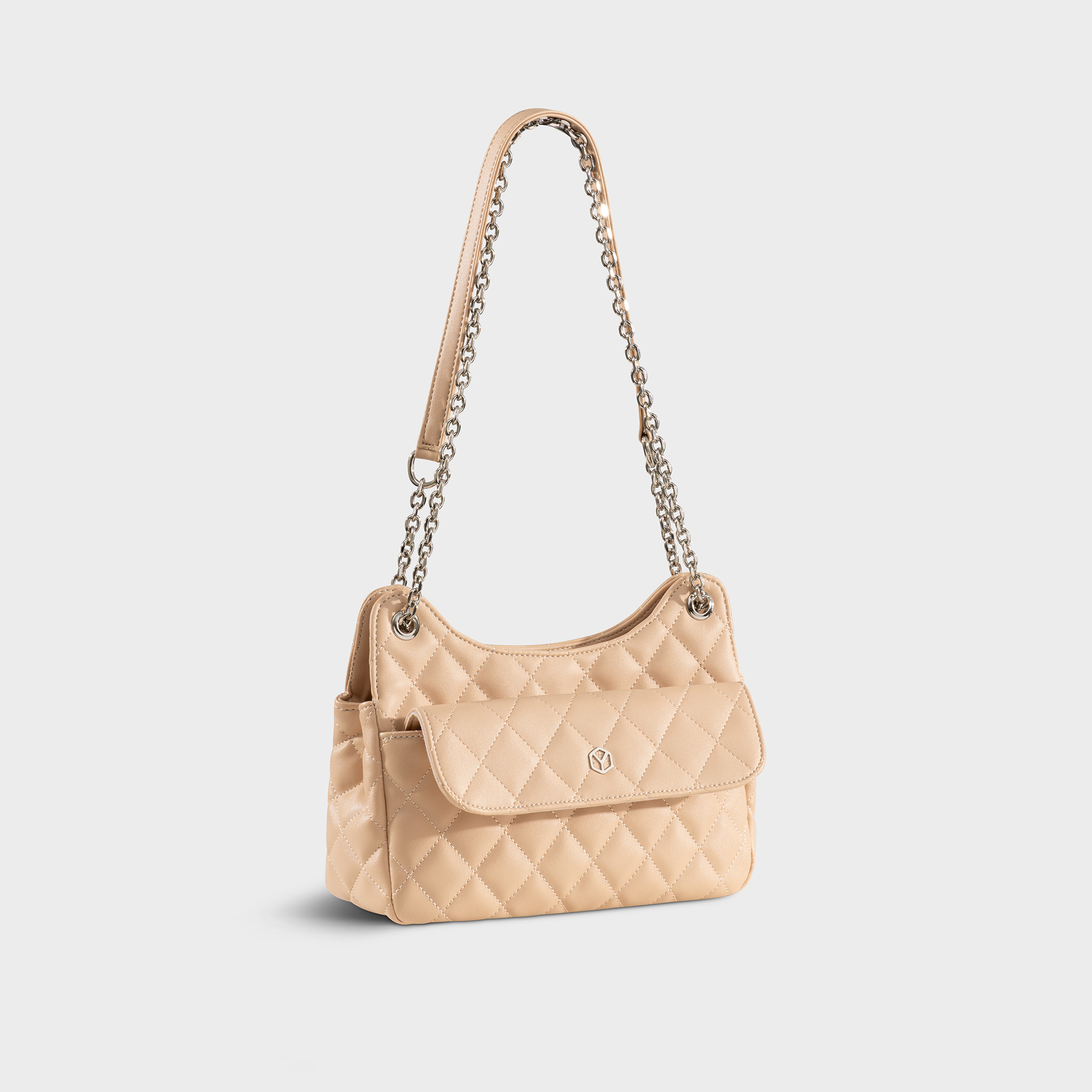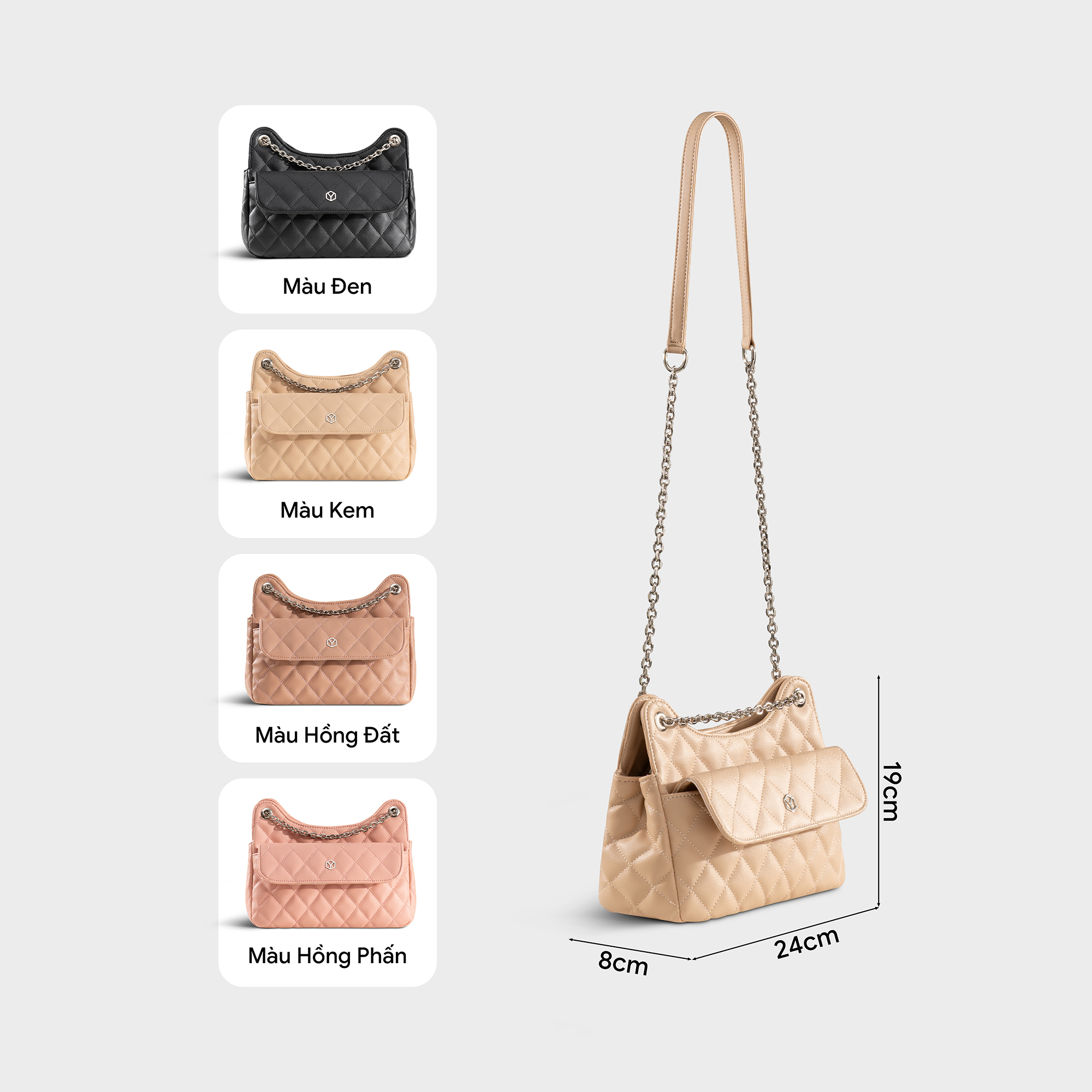 Túi đeo chéo nữ chần bông phối dây xích YN241 với thiết kế mềm mại với chi tiết chần bông sang trọng, kết hợp cùng dây xích kim loại thời trang, giúp nàng nổi bật trong mọi khoảnh khắc – từ dạo phố đến dự tiệc nhẹ. Dây đeo được phối xích bạc linh hoạt vừa có thể đeo chéo hoặc đeo vai gọn gàng. Ngăn chính có thể đựng vừa điện thoại, ví mini, son, phấn, thẻ và những vật dụng nhỏ cần thiết mỗi ngày.