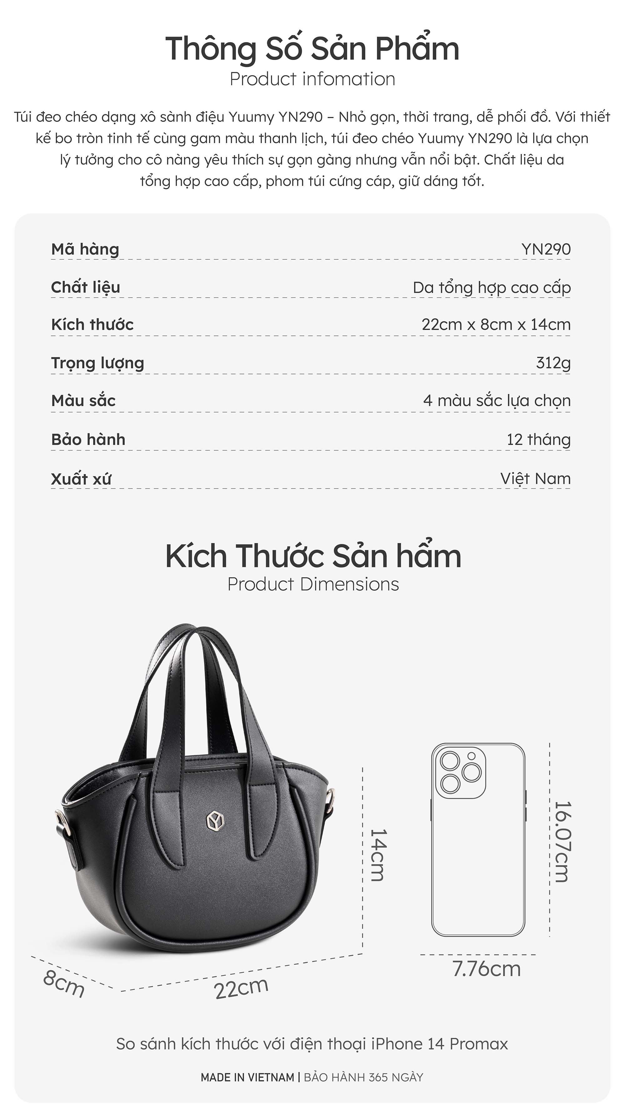 Túi đeo chéo dạng xô sành điệu Yuumy YN290 – Nhỏ gọn, thời trang, dễ phối đồ. Với thiết kế bo tròn tinh tế cùng gam màu thanh lịch, túi đeo chéo Yuumy YN290 là lựa chọn lý tưởng cho cô nàng yêu thích sự gọn gàng nhưng vẫn nổi bật. Chất liệu da tổng hợp cao cấp, phom túi cứng cáp, giữ dáng tốt. Dây đeo điều chỉnh linh hoạt, dễ dàng kết hợp khi đi làm, dạo phố hay cà phê cuối tuần. Túi có nhiều màu trẻ trung, kiểu dáng sành điệu dễ dàng mix & match cùng mọi outfit.