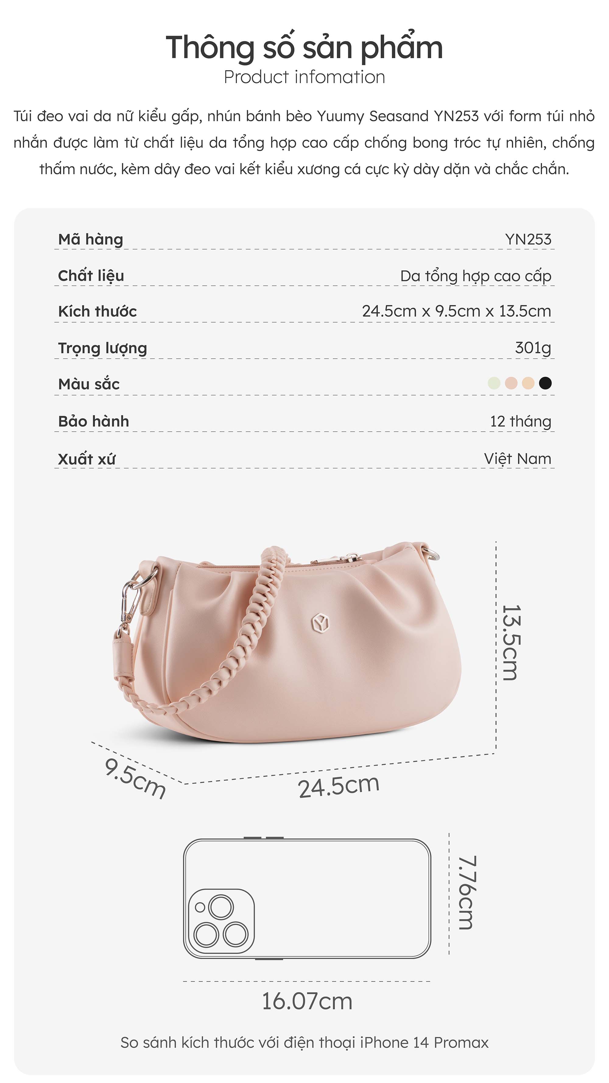 Túi đeo vai da nữ kiểu gấp, nhún bánh bèo Yuumy Seasand YN253 với form túi nhỏ nhắn được làm từ chất liệu da tổng hợp cao cấp chống bong tróc tự nhiên, chống thấm nước, kèm dây đeo vai kết kiểu xương cá cực kỳ dày dặn và chắc chắn. Bề mặt sản phẩm trơn, sáng bóng được cách điệu bằng đường may gấp, nhún rất nữ tính. Bên trong sản phẩm được lót một lớp vải mềm mại kèm 2 ngăn đựng tiện lợi. Những đường chỉ may từ bên trong đến bên ngoài đều rất kỳ công, tỉ mỉ kết hợp với khóa kéo mượt mà tạo nên tổng thể chiếc túi hòa hợp, đẹp mắt. Với 4 gam màu cơ bản dễ phối đồ, sản phẩm rất phù hợp để mang đi dạo, đi chơi, đi làm và đi tiệc.