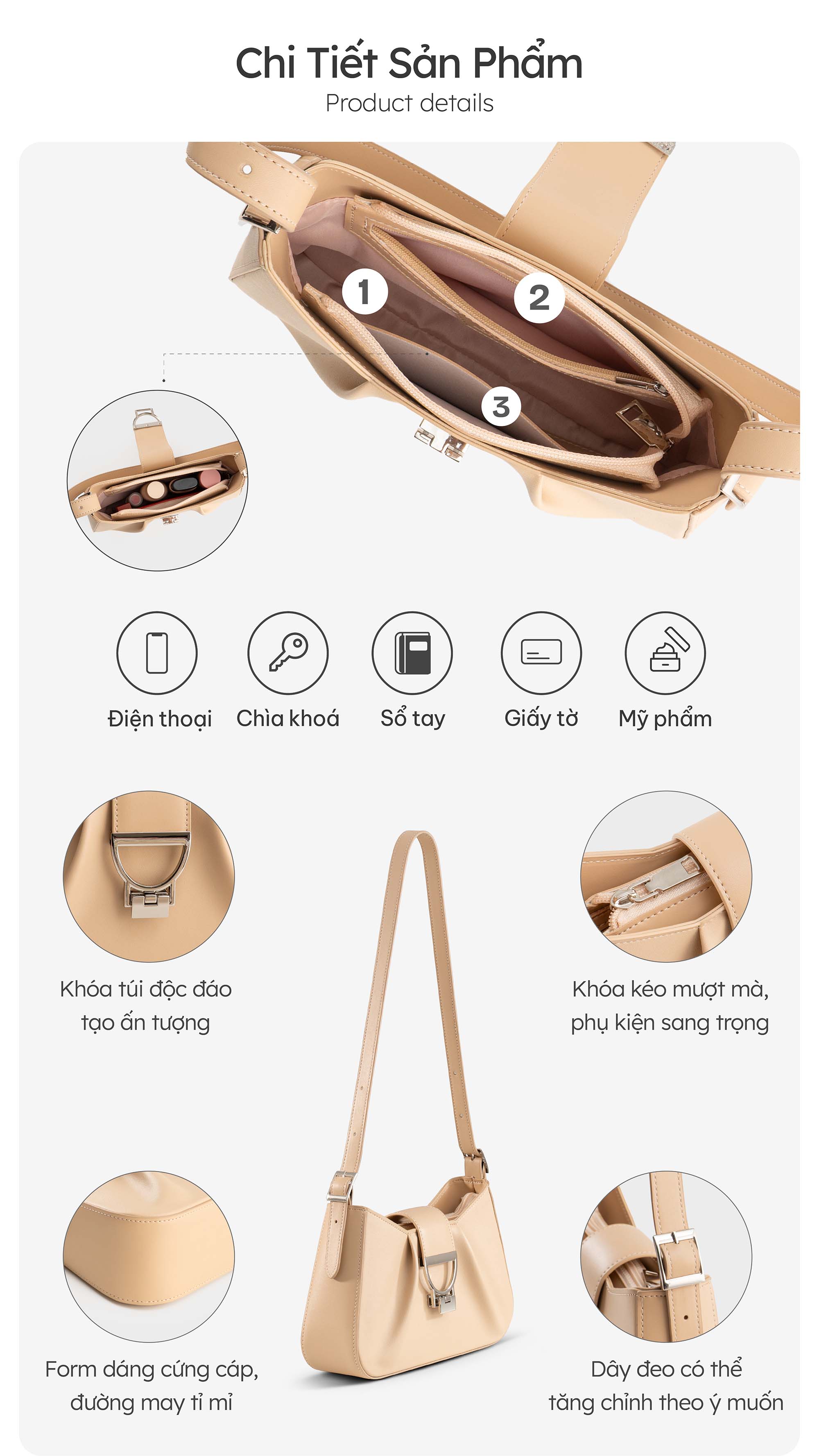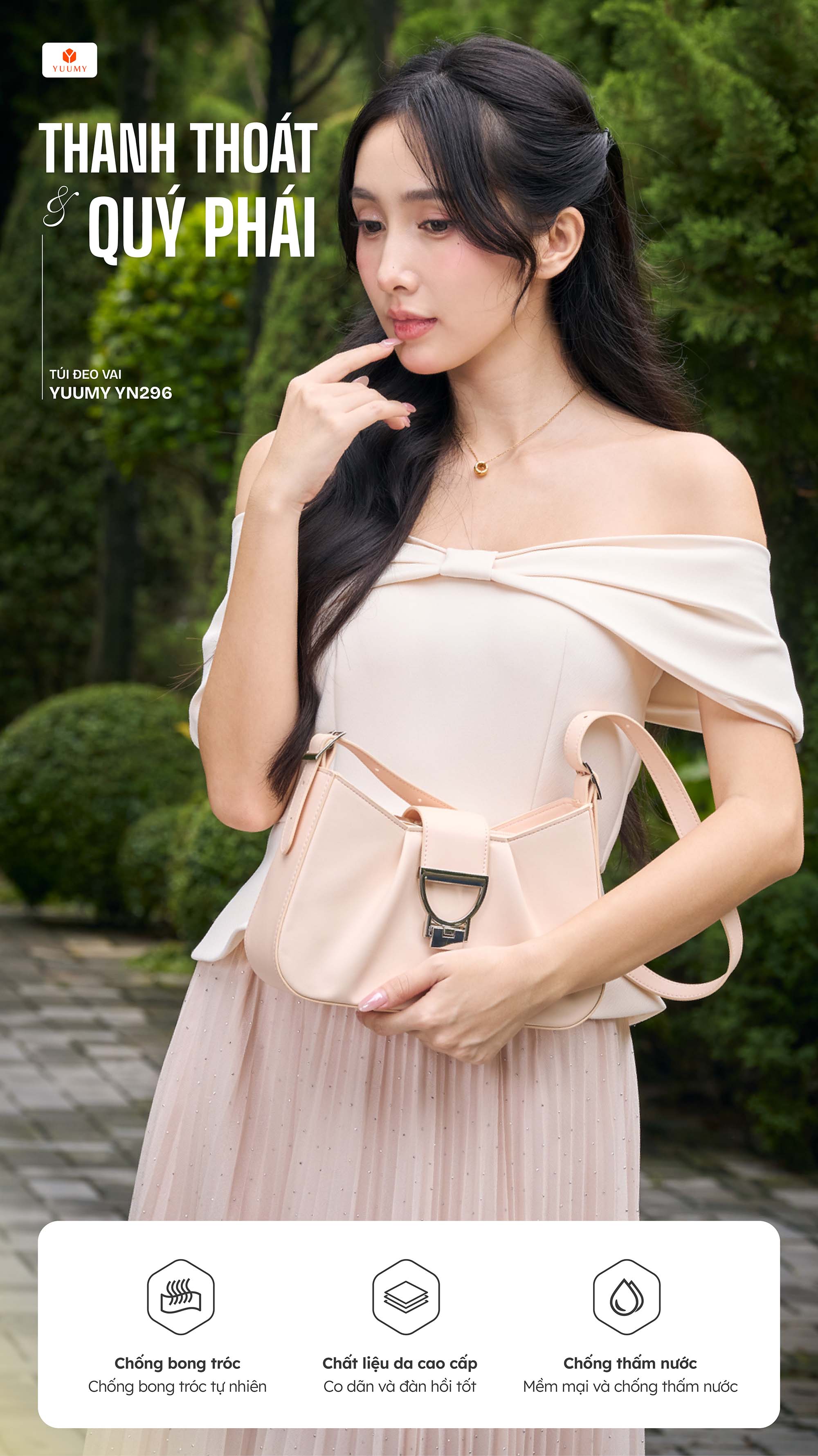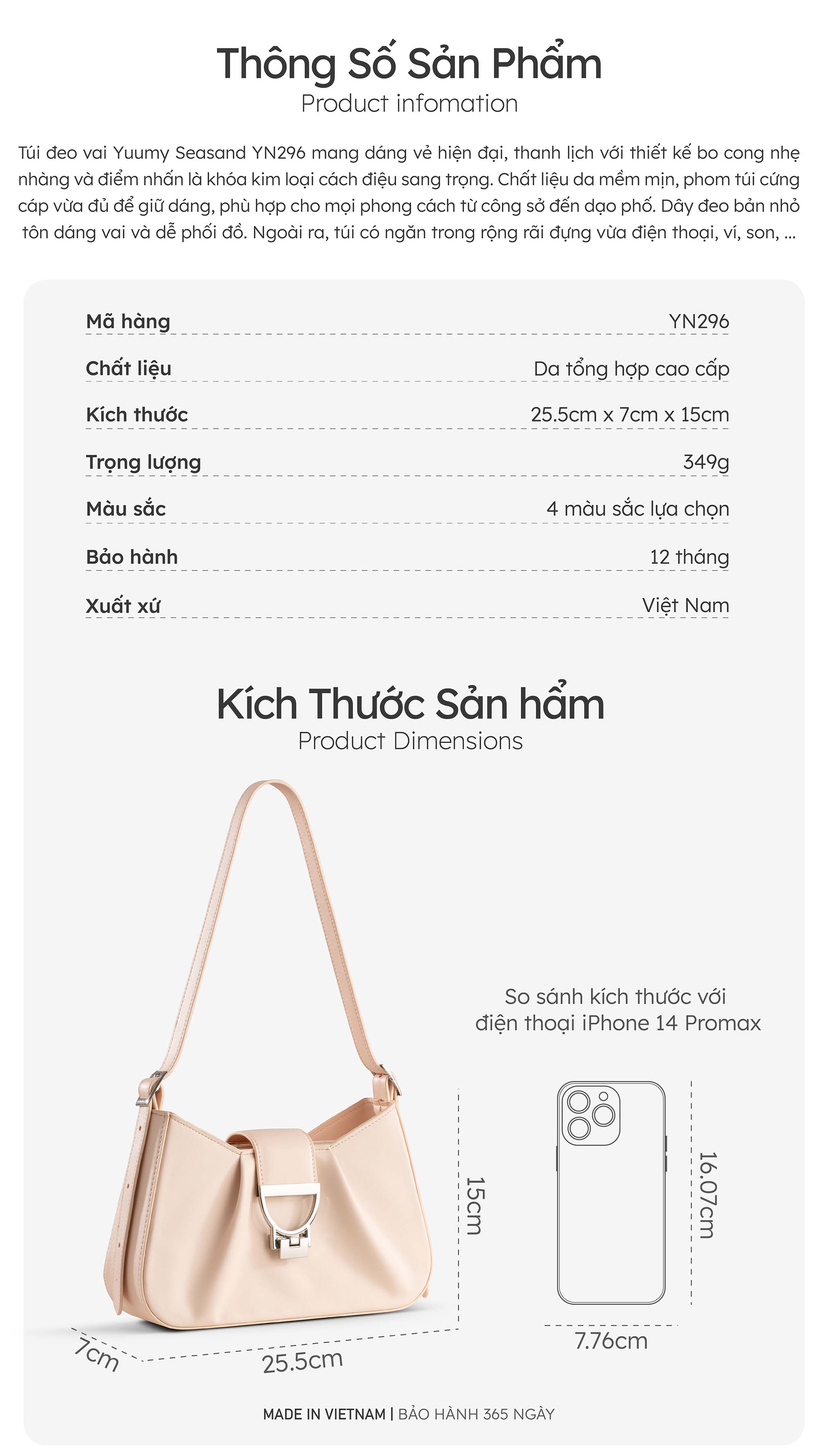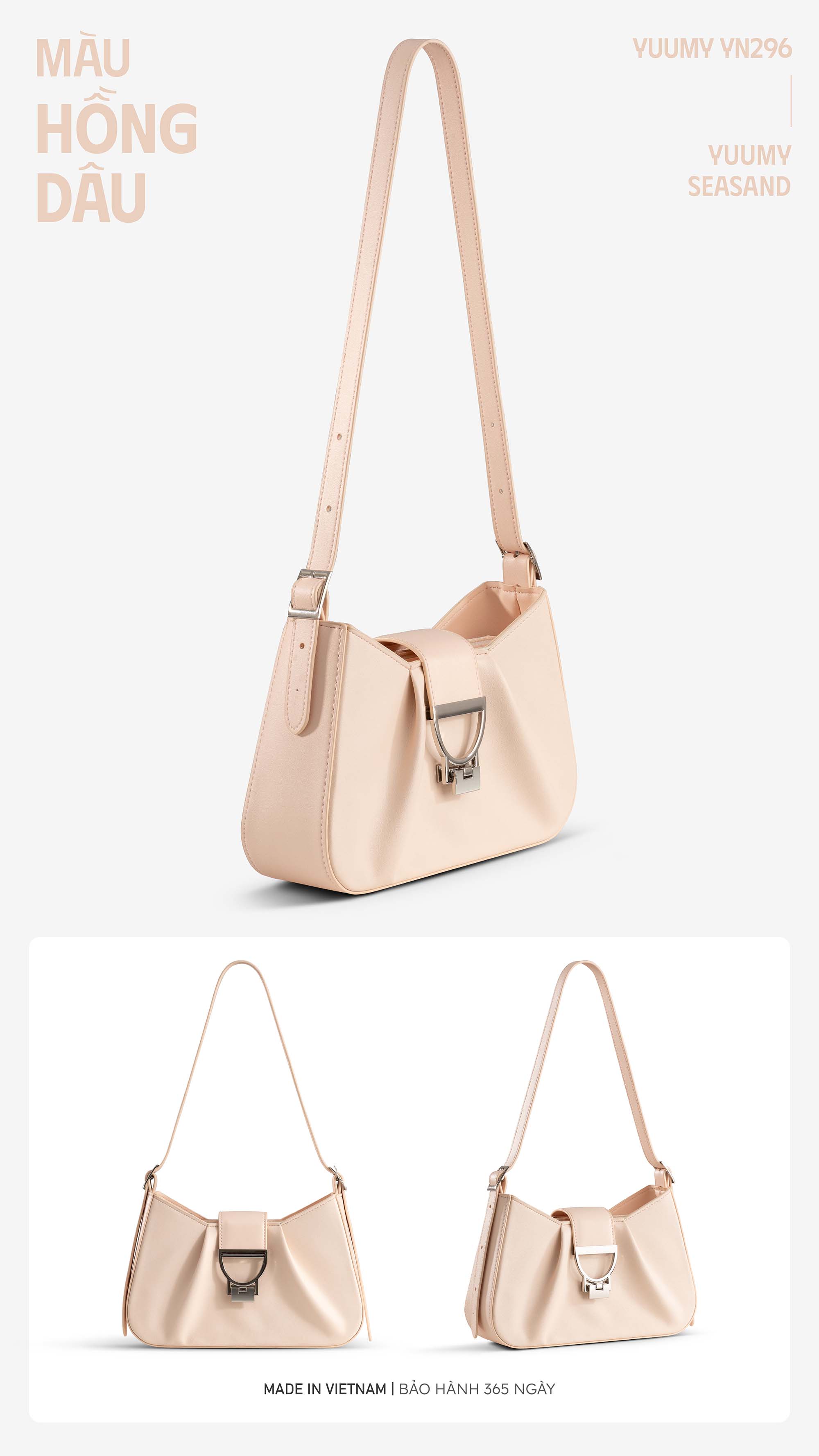 Túi đeo vai Yuumy Seasand YN296 mang dáng vẻ hiện đại, thanh lịch với thiết kế bo cong nhẹ nhàng và điểm nhấn là khóa kim loại cách điệu sang trọng. Chất liệu da mềm mịn, phom túi cứng cáp vừa đủ để giữ dáng, phù hợp cho mọi phong cách từ công sở đến dạo phố. Dây đeo bản nhỏ tôn dáng vai và dễ phối đồ. Ngoài ra, túi có ngăn trong rộng rãi đựng vừa điện thoại, ví, son, phấn,…cùng nhiều gam màu thời thượng sẵn sàng đồng hành cùng bạn trong mọi khoảnh khắc.