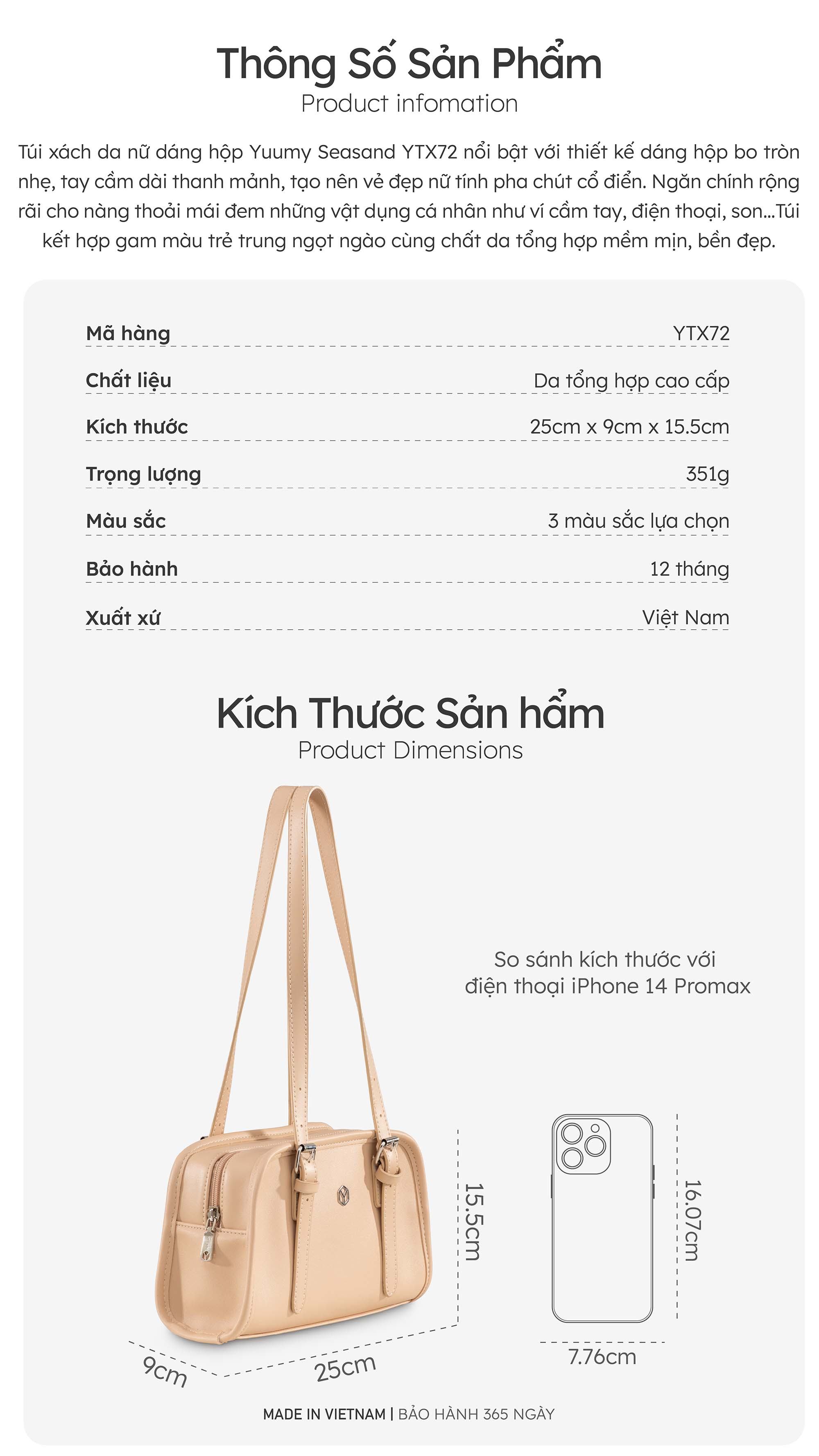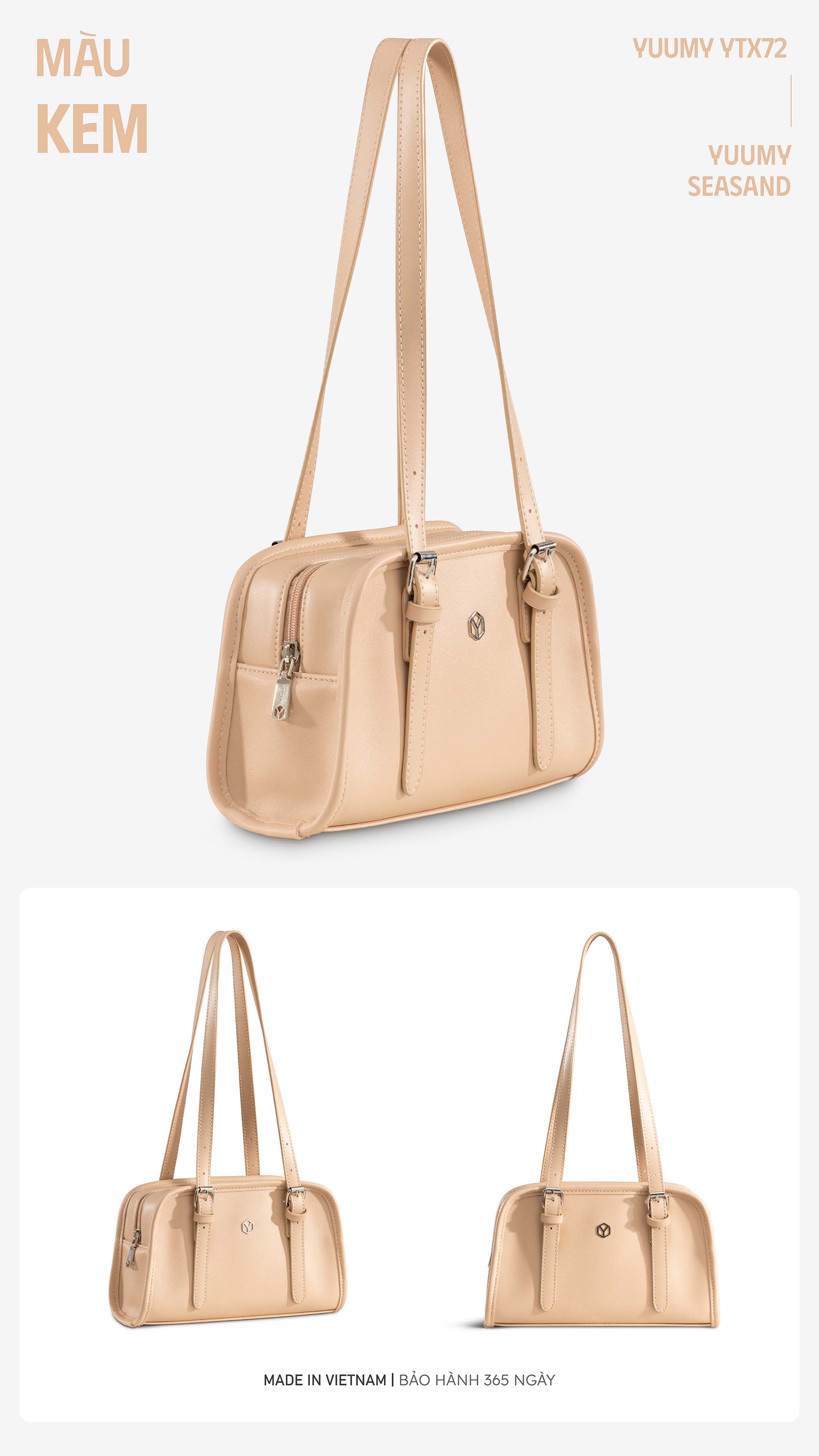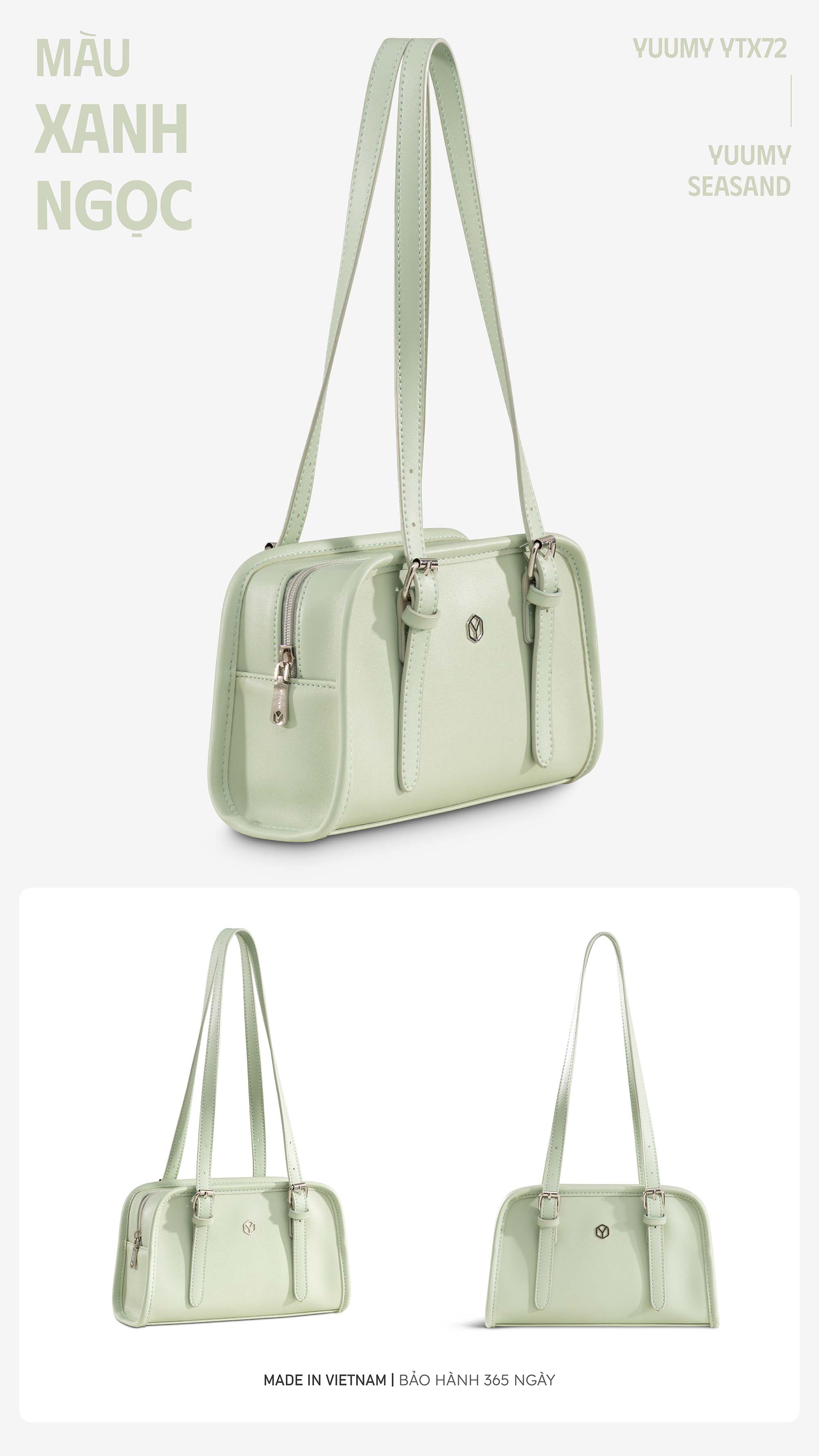 Túi xách da nữ dáng hộp Yuumy Seasand YTX72 nổi bật với thiết kế dáng hộp bo tròn nhẹ, tay cầm dài thanh mảnh, tạo nên vẻ đẹp nữ tính pha chút cổ điển. Ngăn chính rộng rãi cho nàng thoải mái đem những vật dụng cá nhân như ví cầm tay, điện thoại, son…Túi kết hợp gam màu trẻ trung ngọt ngào cùng chất da tổng hợp mềm mịn, bền đẹp. YTX72 là lựa chọn lý tưởng cho nàng từ đi chơi cho đến cô nàng công sở hiện đại, dễ dàng phối cùng mọi phong cách từ nhẹ nhàng đến thanh lịch.