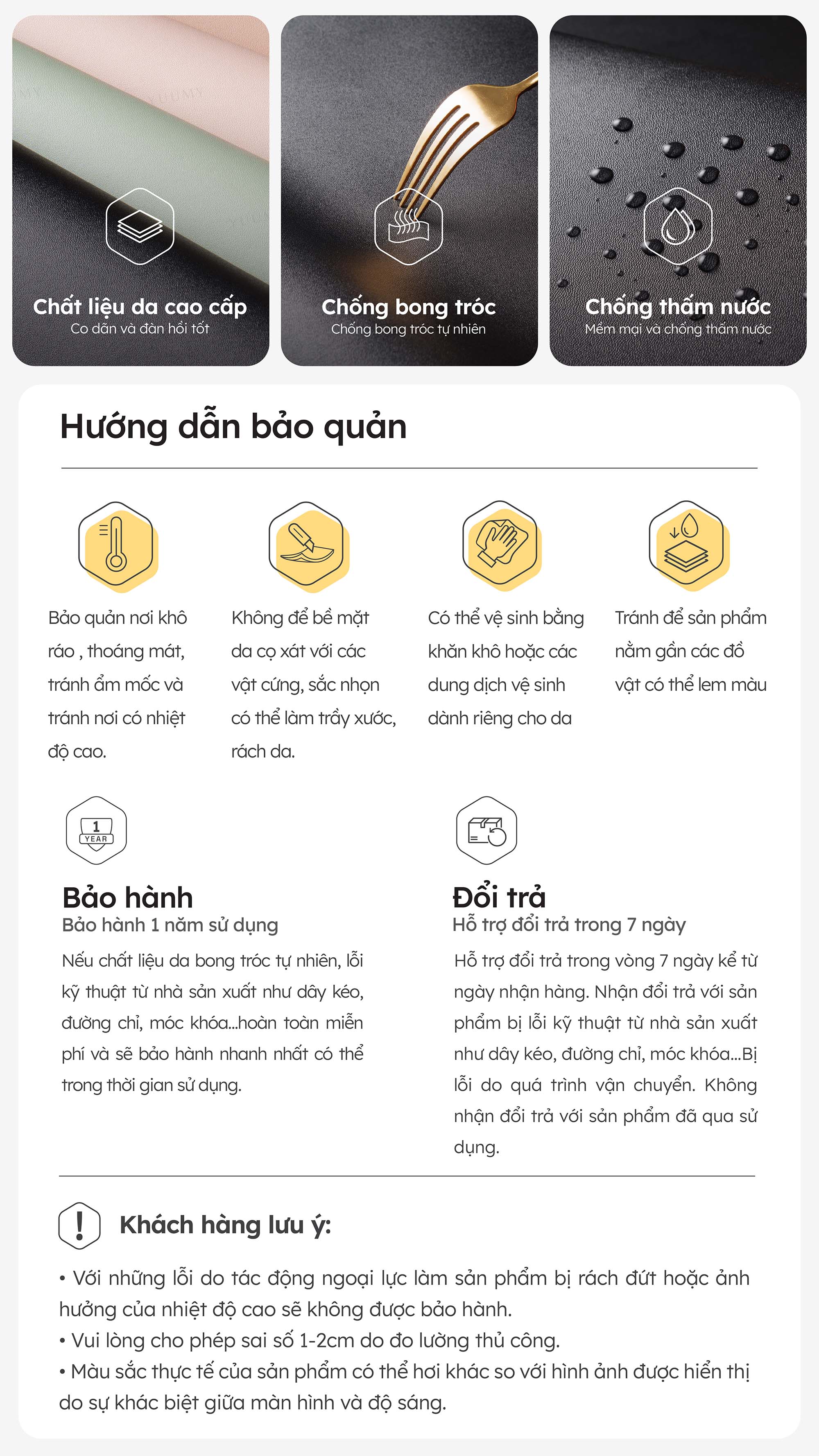 - Có thể vệ sinh bằng khăn khô hoặc các dung dịch vệ sinh dành riêng cho da