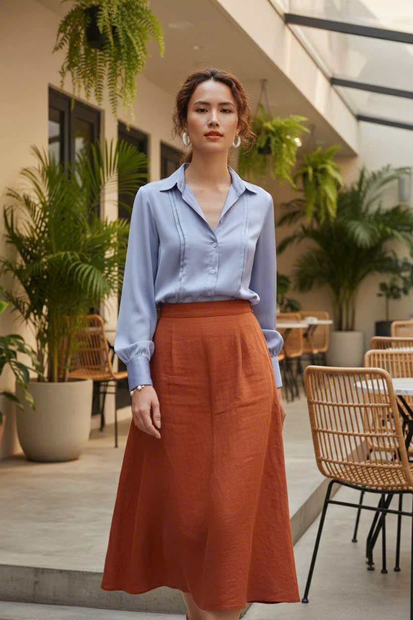 Chất linen mỏng nhẹ khẽ lay trong gió, đủ nghiêm túc để đi làm, đủ thong dong để đi cà phê. Ta chỉ cần chọn áo theo tâm trạng, phần còn lại, váy lo hết.