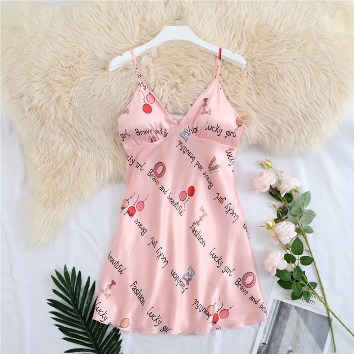 Váy ngủ lụa 2 dây họa tiết lucky hồng đáng yêu có kèm mút ngực