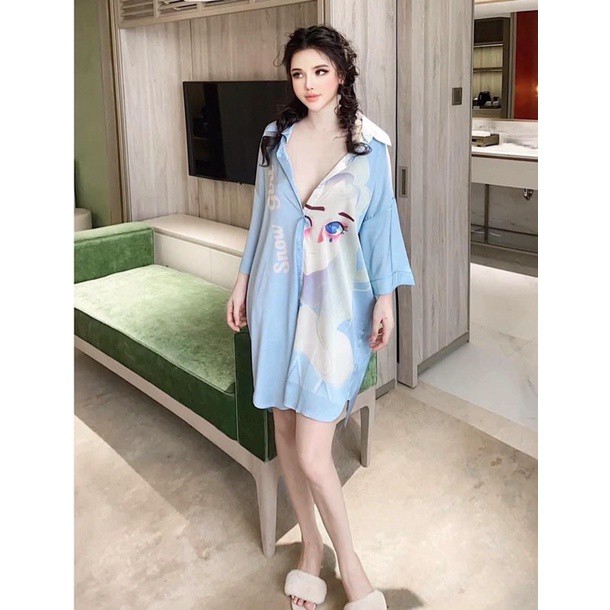Thời Trang Nữ > Đồ ngủ > Váy ngủ || Váy ngủ sơ mi tay dài hình cô gái tóc mây lụa satin cao cấp quảng châu 11