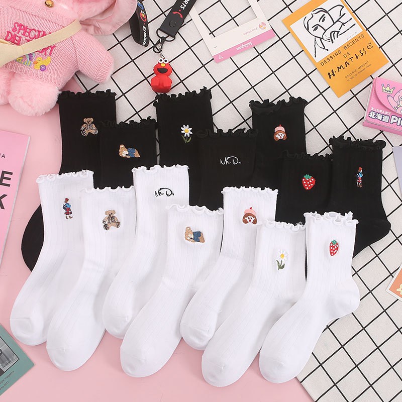 Vớ thêu icon cổ cao xoăn nhún đen